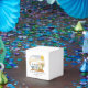 Erlebnisdusche in der Wüste, in der ein Vintager Retro-Camper mit Wäscheleine aus Babykleidung und Kakteen dargestellt wird. In der Textfassung steht: "Das Abenteuer beginnt"