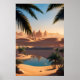 Das Bild zeigt eine ruhige Wüstenlandschaft mit einer blauen Oase im Vordergrund. Palmen umrahmen die Landschaft, ihr üppiges grünes Blattwerk kontrastiert mit den warmen Sanddünen. Der Himmel ist sanft blau, was auf eine friedliche und ruhige Atmosphäre hinweist. In der Ferne erhebt sich ein Haufen Felsformationen, die der Landschaft ein Gefühl von Geheimnis und Grandeur verleihen.