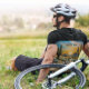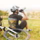 Sonnenuntergangsmalerei eines Fahrrads in der Wüste, umgeben von Kakteen