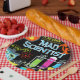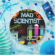 Wütender Wissenschaftler-Geburtstagspapier-Teller, ein großer Entwurf, dass EigenschaftsReagenzgläser, ein Glas Augäpfel, Becher und mehr mit blauem Text mit Weiß umrandeten, das wütenden Wissenschaftler liest! Wir haben die zusammenpassenden wütenden Wissenschaftlergeburtstagseinladungen, die T - Shirts und Schokolade das eingetauchte Oreos!