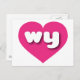 Diese Postkarte zeigt ein lebendiges, heiß-rosa Herz mit den fett-weißen, abgerundeten Kleinbuchstaben, eine spielerische Abkürzung für Wyoming, den Cowboy-Staat. Die Rückseite der Postkarte ist leer und wartet auf Ihren personalisierten Text oder Ihre handgeschriebenen Gefühle.