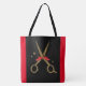 Die goldene Glitzer-Schere kombiniert klassische Schwarz-Gold-Farbkombination. Eleganter Haarstylesensack mit rotem Band (Foto Element).