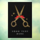 Ändern Sie den Text einfach! Golden Glitzer Schere klassische schwarze Farbkombination. Elegantes Haarstylistin mit rotem Band (Foto Element).