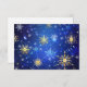 Blauer Weihnachtsgebirge mit goldenen und weißen Schneeflocken. Goldene Schneeflocken. XMAS.