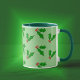 Helle, grüne Zweige von heiligen, auf einem pastellgrünen Hintergrund verstreuten Zwiebeln - der perfekte Weg, um Ihr Lieblingsgetränk zu servieren. Du will ein ganzes Set.