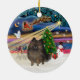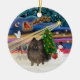 Ein Spitz, der als Blinde dient, bildet den Mittelpunkt dieses bezaubernden Designs mit einigen der wichtigsten Weihnachtszeichen - den drei Weisen, dem Stern von Bethlehem, einem verzierten Weihnachtsbaum, einem Schneemann, einer Taube der Ruhe und dem Weihnachtsmann und seinen Rentieren, die durch den Sternenhimmel fliegen.