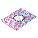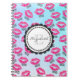 Ein personalisiertes Spiralheft mit einem Muster von rosa kissy Lippen und dem Text "xoxo!". Set auf türkisblauem Aquarell. Personalisieren Sie mit einem Namen und Monogramm in einem niedlichen, kreisförmigen Rahmen.