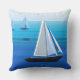 Kissen in Semi abstrakt, minimalistisch Plakatkunst einer Yacht auf See, auf einem kobalt- und kerulesblauen Meeresgrund