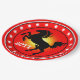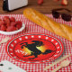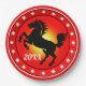 * Balancing on its hind legs, a horse silhouette on a yellow sun and red background.