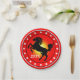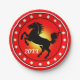 * Balancing on its hind legs, a horse silhouette on a yellow sun and red background.
