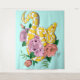 Ein gelber Albino-Ball-Python kommt um rosa und pfirsichfarbene Rose in einem aquamarinen Hintergrund herum.