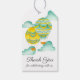 Eine niedliche geschlechtsneutrale Babydusche "Danke"-Geschenkmarke mit einem Farbschema, das für ein kleines Mädchen oder einen kleinen Jungen gut funktioniert. Gelbe und aqua-aquamarine Heißluftballons schweben um den benutzerdefinierten Text herum, den Sie mit Ihrem Wunschtext personalisieren können. Diese Geschenketiketten sind eine wunderbare Wahl für die Krawatte auf Gefallen und verschenken uns bei einer Babydusche oder einer Geburtstagsfeier.