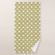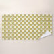 Towels with a geometric star and cross pattern in yellow and brown. The first image shows a towel on a rod, the second shows a washcloth with a corner folded.
