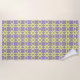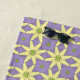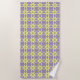 Towels with a geometric floral pattern in yellow and purple are displayed. The top image shows them hanging; the bottom shows a folded washcloth.