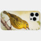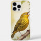 A tiny, yellow bird perches delicately on a thin, leafy branch, its beak open mid-chirp. Sunlight filters through the leaves, casting dappled shadows on its fluffy lemon-yellow feathers and tiny black eyes. The background is a soft blur of spring greens.