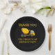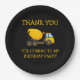 Die Teller des Gelb- und Schwarzzement-Mixer Kindergeburtstags "Danke". Text sagt: "Danke, dass du zu meiner Geburtstagsparty gekommen bist."