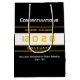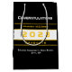 Graduation gift bag in black, white, and yellow — bold horizontal stripe design featuring "Congratulations," graduate name, class year, "Graduate," college, and city in clean, structured typography. Perfect for party favors or presenting a special gift to or from the graduate. Part of a complete graduation collection including announcements, invitations, thank you cards, party invitations, enclosure cards, envelope seals, favor boxes, favor tags, yard signs, and banners. Fully customizable for your Class of [Your Year] celebration. Need design support? Email remidevandesigns@gmail.com RemideVan©