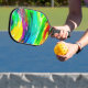 Genießen Sie das Spiel Ihres Lieblings-Paddels mit gelben und blauen lebhaften Farben. USA Pickleball Zertifizierung, Kohlefaserqualität.