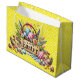Eine helle und fröhliche große Geschenktasche in Gelb mit Kreisläufen und einem Körbchen mit farbigen Eiern und Baby Chicks für Ostern.