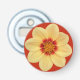 Runder, magnetischer Flaschenöffner mit dem Foto einer gelben Dahlia-Blume auf rotem Hintergrund. Ein schönes, blumengeschmücktes Design!
