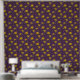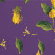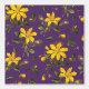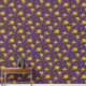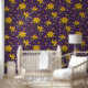 Big flowers pattern wallpaper with yellow flowers. Blooming St. John's Wort, with stems, buds, and leaves, is the seamless pattern printed over dark purple.