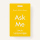 Hellgelbe "Frag Me"-Abzeichen für Freiwillige, Lehrer, Doktoren, Führer, Veranstaltungsorganisatoren für besondere Veranstaltungen wie Hochzeiten, Kunsthandwerksmessen, Zuhause & Garden-Shows, karitative Veranstaltungen, Business und Firmenveranstaltungen. Die Typografie ist ein blasses Elfenbein, das diesem Abzeichen ein modernes Aussehen verleiht. Einfach zu anpassen!