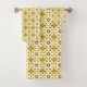 Two images of a yellow towel set with a repeating geometric pattern of white circles and black stars. The top image shows the towel hanging; the bottom is flat.