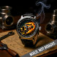This bold watch face prominently features a yellow hot rod car with custom red and black flames painted on its side. The car is depicted on a dark road, with vibrant orange and yellow flames erupting from the ground beside it, resembling fire in grass. Dark, stylized clouds are visible in the background, creating a powerful, intense automotive scene.