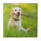 Horizontales Bild eines gelben Labrador-Retriever-Hundes im Gras mit einem Stock im Mund