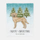 Desteis originelle Cartoon-Illustration eines niedlichen Labrador Retriever Zuchthundes. Der Hund ist in einer Winterlandschaft mit drei grünen Tannenbäumen und fallendem Schnee untergebracht. Der Hintergrund ist ein blaues bis weißes Gefälle, das das Design des kalten Wintertages verleiht. Es gibt auch einen personalisierbaren Textbereich, der jetzt "Frohe Weihnachten!" lautet. Darunter befindet sich ein weiterer personalisierbarer Textbereich für einen Familiennamen oder einen anderen benutzerdefinierten Text.