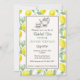 Eine Party Einladung für einen Brauttee, der mit gelben Zitronen und grünen Blätter in einem sich wiederholenden Muster entworfen wurde. Illustriert mit einer Tasse Tee und Wasserkocher.