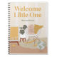 Dieses niedliche Notizbuch illustriert ein Kinderzimmer mit modernem Stil aus der Mitte des Jahrhunderts. Das Kinderzimmer ist in geschlechtsneutralen, gelben Farbtönen gehalten und verfügt über einen Schaukelstuhl mit einem gestopften Tiersonnigen, eine mit Monstertönen verzierte Pflanze und eine gemütliche Boho-Decke. Es liest "Welcome Little One" in großen, modernen Serif-Text mit einem Spot, um mit einem Namen oder anderen Text anpassen. Dieses Notizbuch ist ein großartiges Geschenk für neue Eltern.