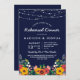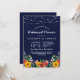 Das Abendessen mit blühenden Navy-Proben lädt mit einer Kombination aus modernen und skurrilen weißen Schriftart, Saitenlichtern und einer hübschen Blume in prächtigen Farben ein - goldgelb, korallenrot, orange und weiß. Das blumengeschmückte Hochzeitsdinner lädt Sie ohne Fotos und mit gelben, orangefarbenen und roten Blume auf marineblarem Hintergrund und einer bezaubernden Typografie ein. Kein Foto Probe Dinner Einladung mit zarten Lichtern und hübschen bunten Blume, Beeren und Grün.