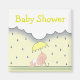 Ein neutraler Anziehmagnet für die Babydusche mit einer Abbildung eines Babys, umgeben von Regentropfen, die auf grünem Gras krabbeln und dabei einen gelben Schirm halten. Gelber Text auf Regenwolke oben steht "Baby Shower". Achten Sie auf passende Einladungen sowie auf eine Version mit anderen Hauttönen und Schirmfarben in der Kategorie "Baby" von Jill's Paperie.