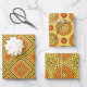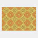 Set aus drei Packpapierblättern mit verschiedenen Dekorationsmustern. Jedes Muster weist geometrische Formen in Gelb- und Orangetönen auf.