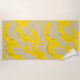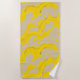 This beach towel features a flowing pattern of organic yellow swirls layered over soft beige and subtle gray accents, creating a smooth, contemporary abstract aesthetic.