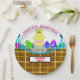 Brown Osterkorb. Dekorierte Eier, die in rosa und grünem Ostergras sitzen und blau den Korbgriff herunterfallen lassen. Happy Ostertypografie in pastellrosa. Niedliches gelbes Küken aus gelb-rosa gestreiftem Ei geschlüpft. Schriftart in rot im schwarz-weißen Rechteck benennen. Original Artwork Design © TamiraZDesign.