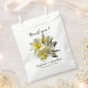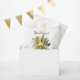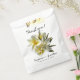 Blumenbeutel, um den Gästen "Danke" zu sagen. Gelbe und weiße Plumeria Blume mit Text über und unter dem realistischen Haufen von Blume. Geben Sie die Namen der Braut und des Bräutigams mit dem Hochzeitstag ein. Weiße Taschen sind in Set von 50 in zwei Papiertypen erhältlich.