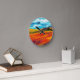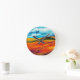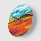 Farbenfrohe abstrakte Hügellandschaft und Himmel in Gelb-, Rot-, Grün- und Blautönen.