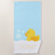 Quack, Quack! Das von der Designfirma Enchantfancy entworfene Yellow Rubber Ducky Beach Handtuch besticht durch eine niedliche gelbe Ente, die auf Badeblasen schwebt. Personalisieren Sie mit Ihrem Namen! Dieses Badetuch ist ein wunderbares Geschenk für Kinder, die einen Pool oder einen Strand lieben.