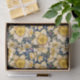 Be ready for those first shoots of daffodils this spring, as it is so hard to time the weather these days. These pretty garden print shows creamy and yellow daffodils on a mellow marine blue background dotted with small pink flowers. Seamless image.