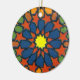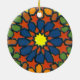 Ein buntes Rundschmuck mit einem traditionellen islamischen Muster, bestehend aus einem gelben Stern, umgeben von geometrischen Formen in Blau, Orange, Terrakotta und Grün, alle in schwarz umrissen. Das Design stammt von einem Siebdruck von Judy Adamson.