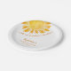 Diese Babyduschpapier-Teller sind mit dem Text "Ein kleiner Sonnenstrahl ist fast hier!" mit einer Aquarellgelben Sonne versehen. Ideal für eine geschlechtsneutrale Babydusche. Einfach anpassbar. Original Wasserfarbe © Michele Davies.