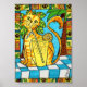Dekorieren Sie Ihre Wände mit diesem einzigartigen, farbenfrohen Miniposter der Folkloregie. In diesem niedlichen, skurrilen Kunstwerk sitzt diese fröhlich-gelbe Tischkatze mit orangefarbenen Streifen auf einem blau-weiß karierten Tischdecken neben einem großen, kalten Limonadenglas mit Eiswürfeln, einem blau gestreiften Stroh und einer Zitronenscheibe. Palmen und klarer blauer Himmel sind im sommerlichen Hintergrund des tropischen Strandes sichtbar. Die gesamte Szene ist von einem detaillierten, passenden Rahmen mit Blätter, Zitronenschnitzen und Pfotendrucken umgeben.