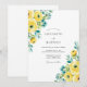 This artwork showcases a vibrant arrangement of yellow watercolor ranunculus paired with teal foliage. The design features soft blue-green leaves and delicate accent flowers that create a refreshing botanical aesthetic. Hand-painted textures and a bright color palette offer a cheerful atmosphere, ideal for a seasonal nature-themed event.