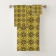 Yellow towels with black geometric patterns hang from a silver rod and are laid flat. The design has circular and star shapes, giving a vibrant, modern feel.