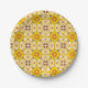 Two views of a decorative plate with a vibrant, symmetrical pattern feature yellow, white, and orange floral and geometric designs, conveying a cheerful tone.