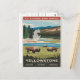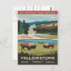 Ein Vintages Poster, das zwei Bison-Weiden eines Sees im Yellowstone Nationalpark darstellt. Das Poster bietet eine landschaftliche Kulisse von Bergen und Bäumen und das symbolträchtige Yellowstone Nationalpark-Logo oben rechts.