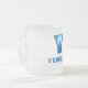 Yemaya mattierte Tasse aus Glas mit Namen und iconischen Y und Kuchen Design, beide bedruckt in zwei Farben blau.