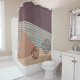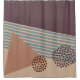 This shower curtain has a mid-century modern abstract design of a blue line, a tan triangle, and a brown circle made of dots on a field of dark eggplant and cream. If you want the same design with different colors, message me.